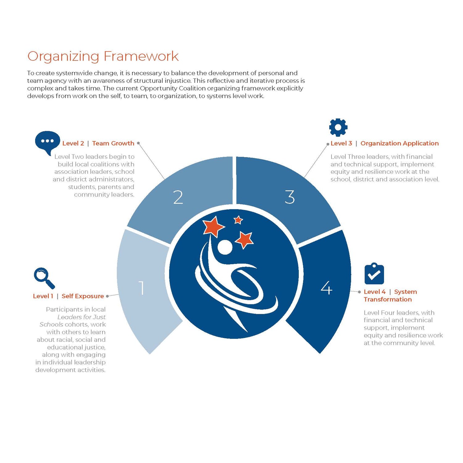 We have developed a four stage organizing framework, starting with individual reflection and growth, moving to team building and culminating with organizational and system transformation. Click below to join a Level I Leaders for Just Schools next year.
